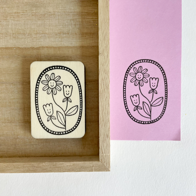 Vrolijke houten stempel met drie bloemen en lachende gezichtjes in een cirkel. Perfect voor craft projecten, DIY en knutselen met kinderen. Een duurzame en speelse stempel die elke creatie opfleurt!