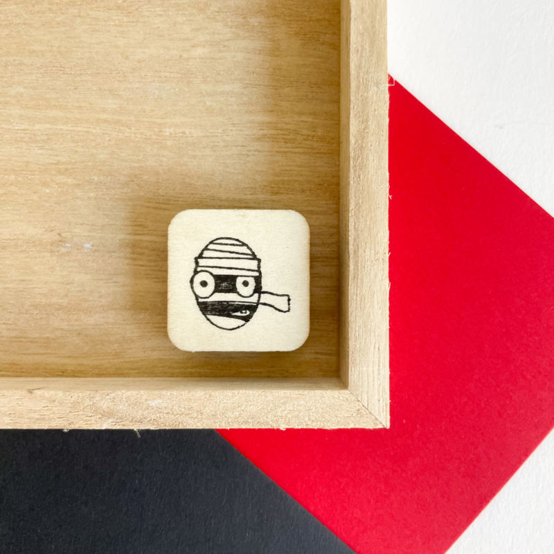 Grappige houten stempel met een gek gezichtje in mummie-verpakking.