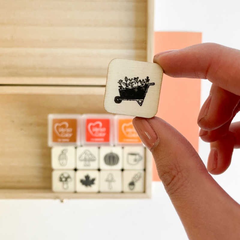 Houten stempel met een kruiwagen vol bloemen en groen.
