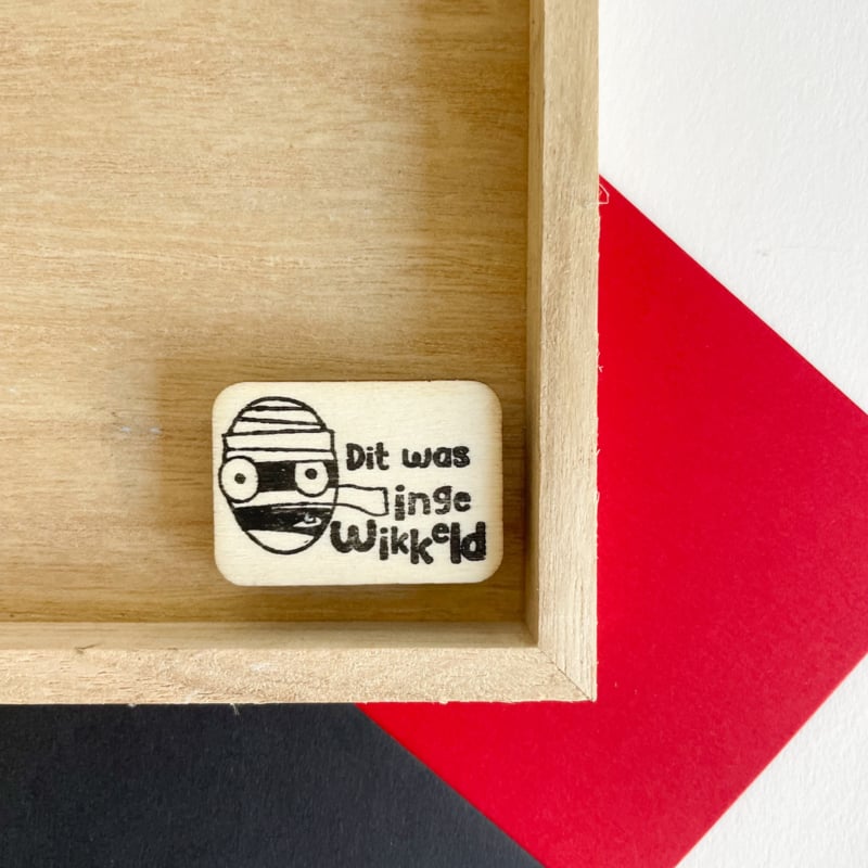 Een houten stempel speciaal voor in de klas of bij huiswerk. Met een vrolijk mummie-figuurtje en de tekst “Dit was ingewikkeld” kun je op een luchtige manier laten zien dat een opdracht best pittig was. Leuk voor leerlingen én handig voor de juf of meester.