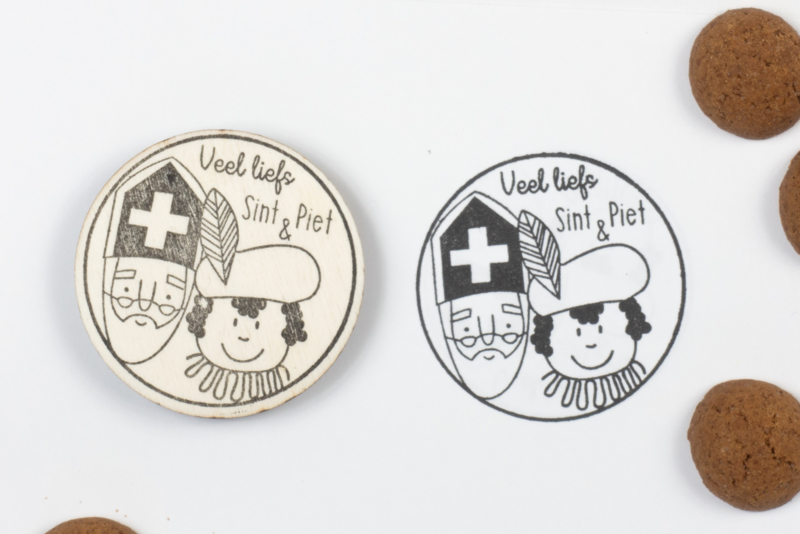 Ronde stempel met de tekst 'Veel liefs Sint & Piet'.