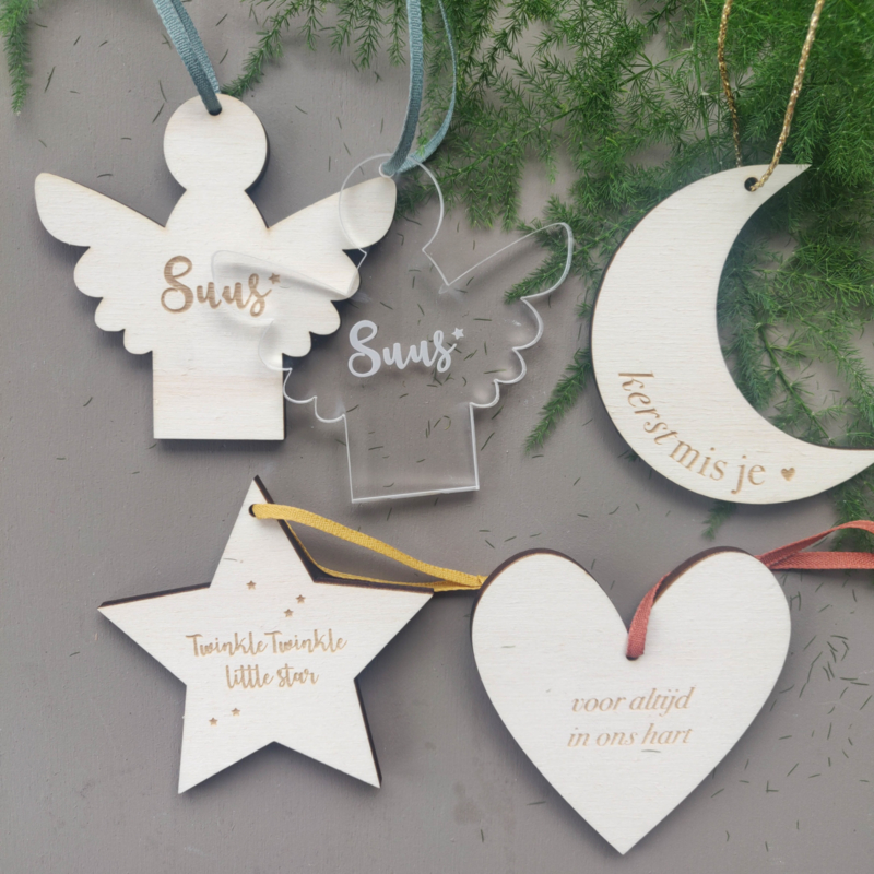 Personaliseer de kersthanger met een eigen tekst. Je kunt kiezen voor een naam, geboortedatum en/of korte zin.