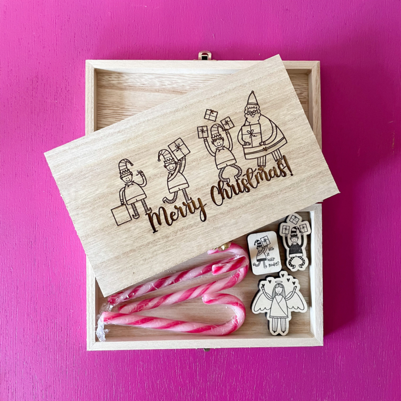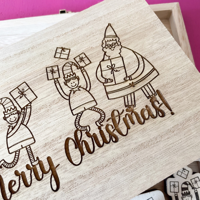 Houten kistje met feestelijke kerstman en kerstelfen gravure. Bijvoorbeeld om jouw december stempels en inkt handig bij elkaar te bewaren. Ook leuk om kerststempels in cadeau te geven!