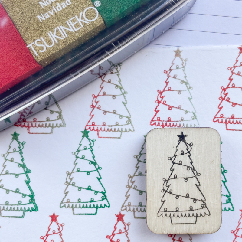Stempel deze mooi verlichte kerstboom op kaartjes, labels of maak er eigen feestelijk cadeaupapier mee.