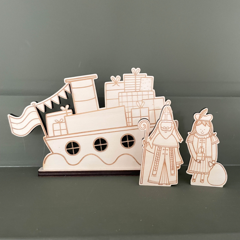 Als Sint en Piet naar Nederland komen is het feest! Met deze houten figuren zit de stemming er meteen in. Leuk voor in de vensterbank of in de speelbak.