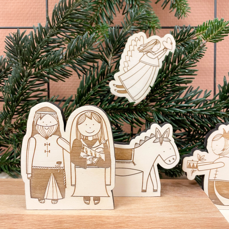 De set bestaat uit de volgende 4 houten kerstillustraties:∙ Jozef, Maria, kindje Jezus