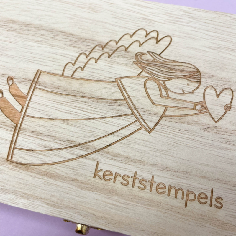 Houten kistje met feestelijke kerst gravure. Bijvoorbeeld om jouw kerst stempels en inkt handig bij elkaar te bewaren. Ook leuk om kerststempels in cadeau te geven!