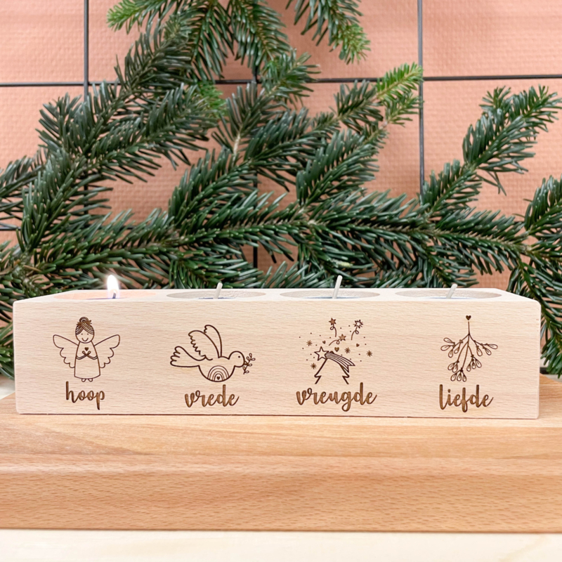 Lichtjes horen bij kerst. Met deze advent kaarshouder kun je in de 4 weken voorafgaand aan kerstmis steeds een extra kaarsje branden. De houder is gegraveerd met illustraties en tekst, zoals op…