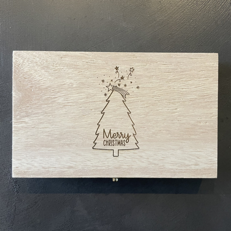 Houten kistje met feestelijke kerst gravure. Bijvoorbeeld om jouw kerst stempels en inkt handig bij elkaar te bewaren. Het kistje is ook te gebruiken als leuke cadeau verpakking!