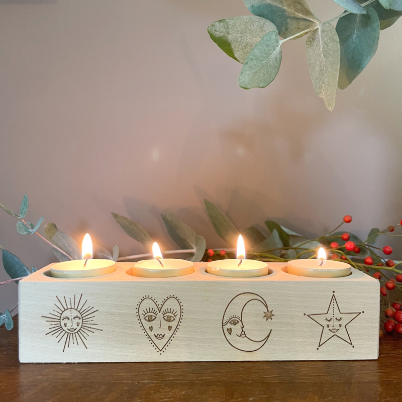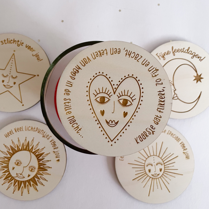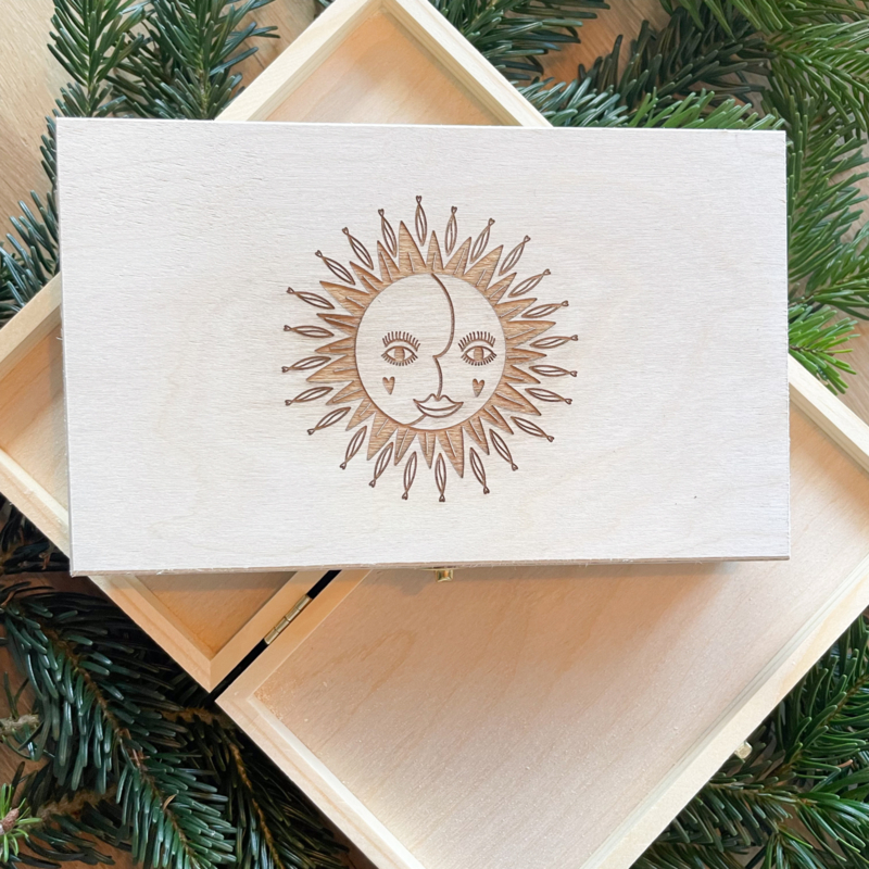 Houten kistje met feestelijke zon gravure. Bijvoorbeeld om jouw kerst stempels en inkt handig bij elkaar te bewaren. Ook leuk om kerststempels in cadeau te geven!