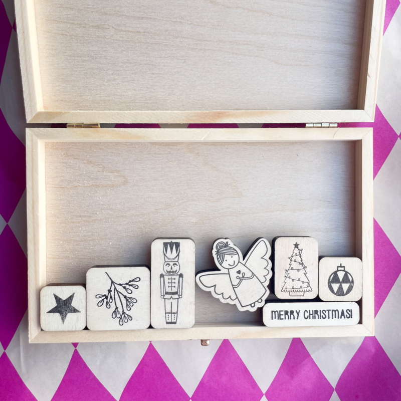 Kistje Kerst incl. stempelsHouten kistje S inclusief 7 kerststempels
