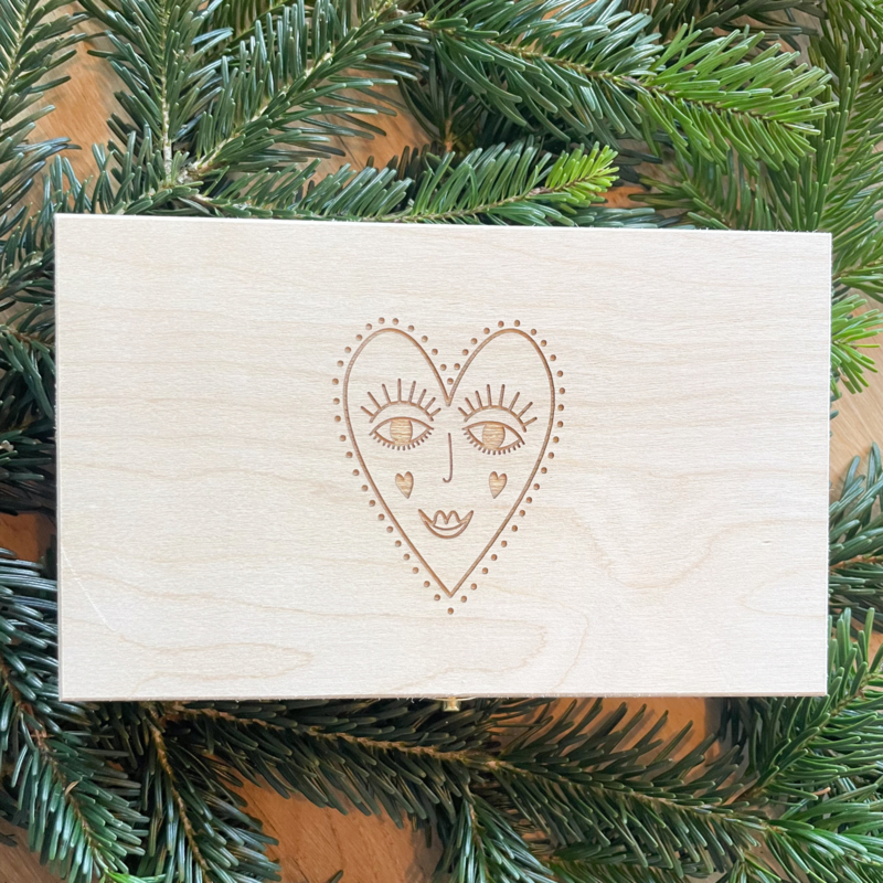 Houten kistje met feestelijke hart gravure. Bijvoorbeeld om jouw kerst stempels en inkt handig bij elkaar te bewaren. Ook leuk om kerststempels in cadeau te geven!